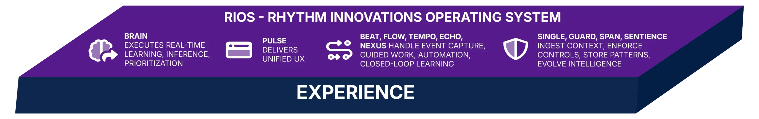 At the application tier sits the Rhythm Innovations Operating System™ (RIOS™), an eleven-layer intelligence framework that standardizes safety work across roles while remaining configurable to each customer’s workflows.