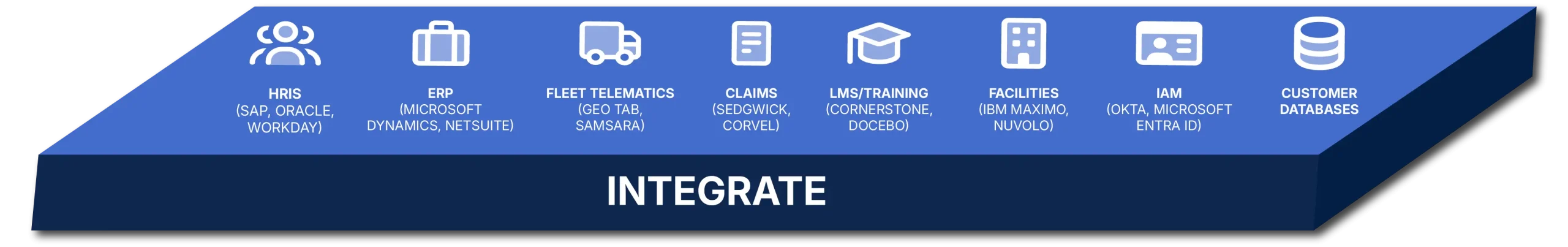 The Integration layer provides connectors and pipelines into internal and external systems, HRIS, ERP, fleet telematics, claims, LMS/training, facilities, IAM, and customer databases.