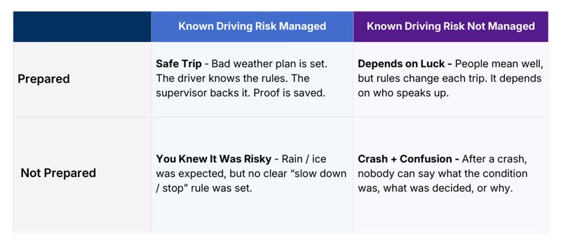 • Do drivers and supervisors understand what changes by condition (not by month)?